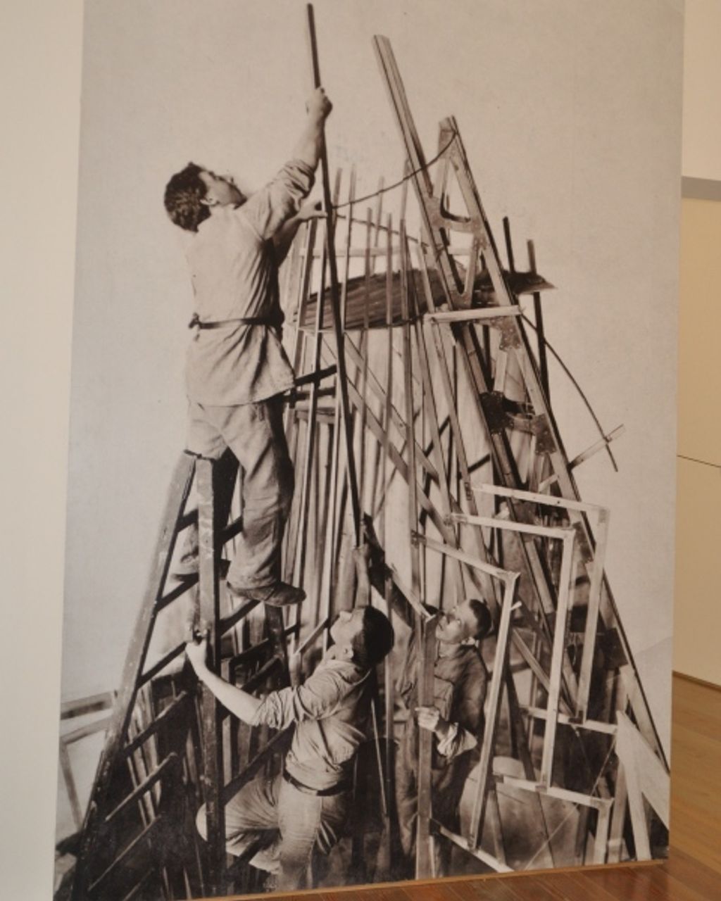 Historisches Foto aus Dokumentationsteil der Ausstellung: Tatlin mit Helfern beim Turmbau, Petrograd 1920, unbekannter Fotograf