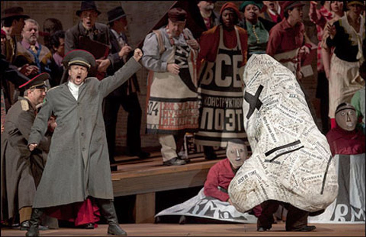 Kentridge, with good intentions, tried to use photos and animation to relate Gogol’s story to Soviet reality. He wanted, according to the program, to “make the analogy” between the disappearing nose and “the kinds of erasures and changes to photographs of that period.” The program quotes the director: “It’s like those retouched photographs we’re all so familiar with—Trotsky’s in the photo, then he gets retouched out and he’s disappeared.” Elsewhere the program describes Kentridge’s vision of the opera as “more steeped on the specific moods and happenings of the early Soviet Union in the 1920s and 1930s—a period of wonderful experimentation followed by a crackdown after Stalin took power.”
