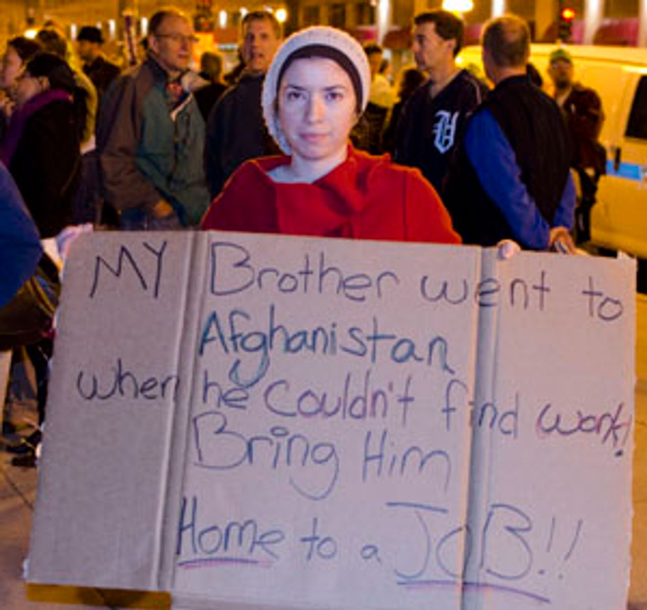 SandraSandra, an IT worker, carried a sign calling for her brother to be brought back from the war in Afghanistan. She said, “I have two degrees in art and music, but I couldn’t find any jobs. I am now working in the IT field. Music and the arts are no longer supported in the United States, so I had to switch careers.”