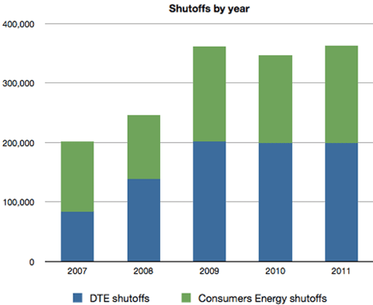 The shutoffs in 2011 by DTE were nearly two and a half times the level in 2007, before the onset of the economic crisis. That is, as more people are suffering from unemployment and poverty, the utility companies have moved ruthlessly to deny them the most basic necessitates.