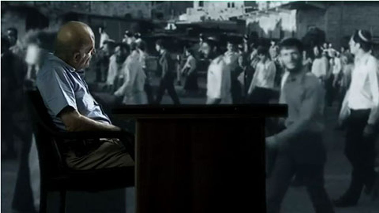 The film’s approach is unusual and compelling. At the outset the viewer watches the silhouettes of a film crew moving about behind the scenes constructing a rudimentary office in front of a large, wall-sized movie screen, as Alexandrowicz speaks off-camera on the film’s subject matter, the nature of documentaries and his personal goals for the endeavor. Film images of the Occupied Territories from 1967 to the present are projected on the big screen during the interviews.