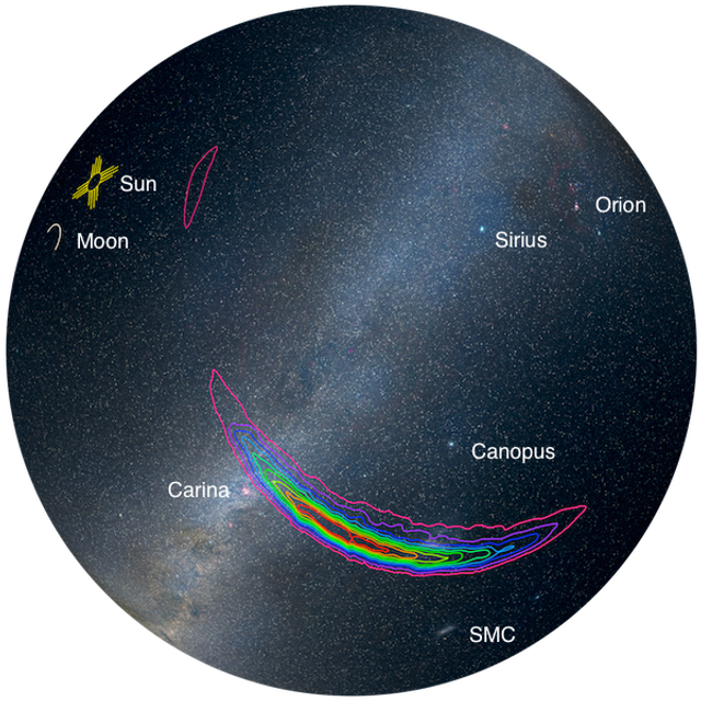 ආසන්න වසයෙන් ආලෝක වර්ෂ බිලියන 1.3ක් ඈතින් පෘථිවියේ දක්ෂින අර්ධගෝලයේ ජීඩබ්ලිව්150914 නිර්මානය කරමින් සිදු වූ ද්විමය කලු කුහර සංයෝජනය. වර්නිත රේඛාවලින් පෙන්නුම් කෙරෙන්නේ සංඥාව ජනනය වූ කලාප යි. හුදෙක් අනාවරක දෙකක දත්ත මත පදනම් ව නිශ්චිත ස්ථානය නීර්නය කල නො හැක. තුන්වන අනාවරකයක් මේ වසරේ සේවය අරඹනු ඇත.(ස්තුතිය: ලිගෝ එකමුතුව) Credit: LIGO Collaboration