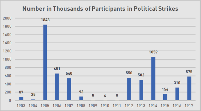 ට්‍රොට්ස්කි සිය රුසියානු විප්ලවයේ ඉතිහාසය කෘතිය තුල පහත දැක්වෙන වගුව ඇතුලත් කරයි. 11 එහි ආර්ථික (ඉල්ලීම් මත සිදු කෙරුනු) වර්ජන හා දේශපාලන වර්ජන අතර විලක්ෂනයක් දැක්වේ. ආර්ථික වර්ජනයක් වැටුප්, වැඩකරන පැය ගනන හෝ සේවා කොන්දේසි පිලිබඳව සැලකිලිමත් වූ අතර, දේශපාලන වර්ජන ආන්ඩුවේ පිලිවෙත්වලට අභියෝග කිරීම, අනෙකුත් කම්කරුවන් හෝ ඔවුන්ගේ නායකයන්ට හිංසා පීඩා පැමිනවීමට එරෙහිව විරෝධය පෑම, එසේත් නැතහොත් - ලේ වැකි ඉරිදා වැනි - කිසියම් වැදගත් ඓතිහාසික සංසිද්ධියක සංවත්සරය සනිටුහන් කිරීම සිදු කලේය. 12 සත්තකින්ම බොහෝ වර්ජනවලදී දේශපාලන හා ආර්ථික යන දෙවර්ගයේ ම ඉල්ලීම් ඉදිරිපත් කෙරුනු අතර, කිසියම් දෙන ලද වර්ජනයක නියැලී සිටි තනි කම්කරුවන්ගේ විඥානය නායකත්වය විසින් මතු කෙරුනු ඉල්ලීම්වලින් ඔබ්බට ගමන් කලා විය හැකිය. කෙසේවෙතත්, දේශපාලන වර්ජනවල වර්ධනයවීම මෙකී කාල පරිච්ෙඡ්දය තුල කම්කරු පන්ති ව්‍යාපාරයේ දේශපාලන විඥානය පිලිබඳ වැදගත් බැරෝමීටරයක් (පීඩනමානයක්) විය.