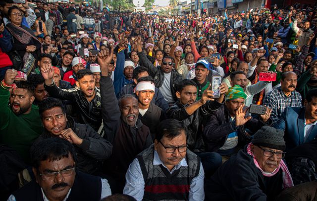 2019 දෙසැම්බර් 20 සිකුරාදා ඉන්දියාවේ නල්බාරි හි දී පුරවැසි නීතියට එරෙහි උද්ඝෝෂනය [ ඡායාරූපය අනුග්‍රහය/අනුපම් නාත් (AP Photo/Anupam Nath)]