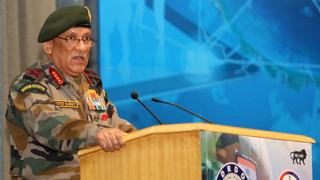 2018 දී නව දිල්ලියේදී හමුදා මාන්ඩලික ප්‍රධානී ජෙනරාල් බිපින් රාවත් (ස්තුතිය: ඉන්දීය ආරක්ෂක අමාත්‍යාංශය)(Credit: Indian Ministry of Defence)